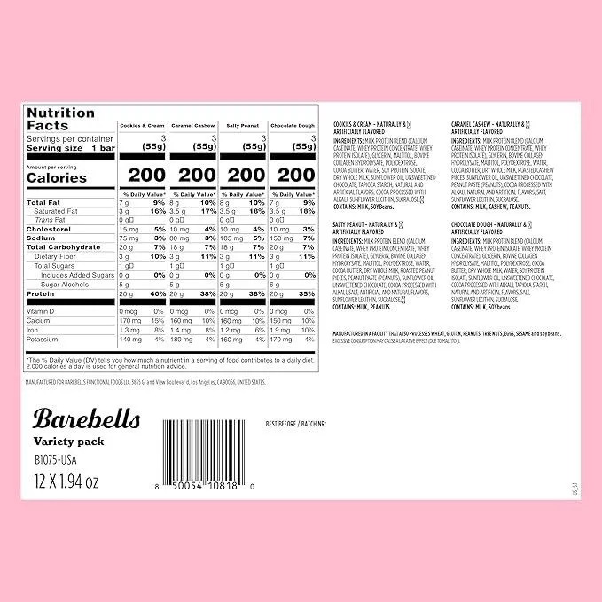 - BAREBELLS VARIETY PACK PROTEIN BARS - 12 individual yummy Barebells protein bars! Tired of eating bars that taste like cardboard? Our protein bar variety pack is a delicious mix of some of our fan favorite flavors, all with 20 grams of protein – (3) Cookies & Cream, (3) Caramel Cashew, (3) Salty Peanut, and (3) Chocolate Dough.