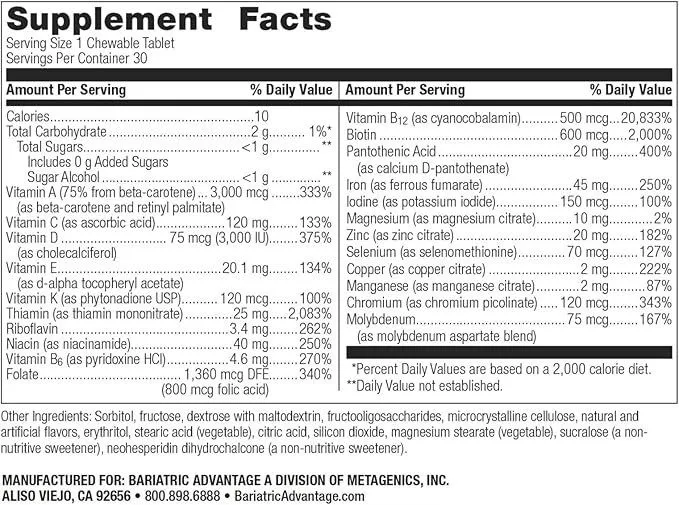 • Daily Multivitamin for bariatric procedure recovery: A potent, iron-fortified once-daily chewable designed to fulfill your everyday nutritional needs