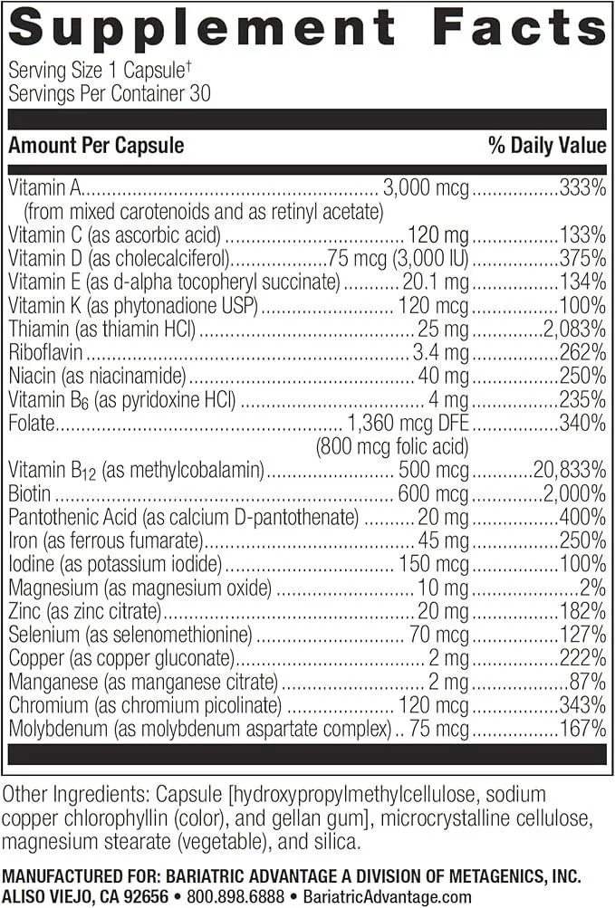 • Daily Multivitamin for bariatric procedure recovery: A potent, iron-fortified once-daily capsule designed to fulfill your everyday nutritional needs