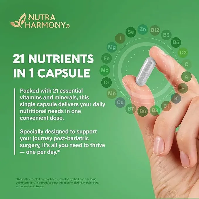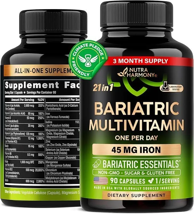 - Post-bariatric Support 21 in 1 — Bariatric multivitamin by NUTRAHARMONY formulated & developed to meet the needs of men and women in post-bariatric surgery of all types. Gastric bypass vitamins containing a complete multivitamin from all essential 21 vitamins and minerals.
