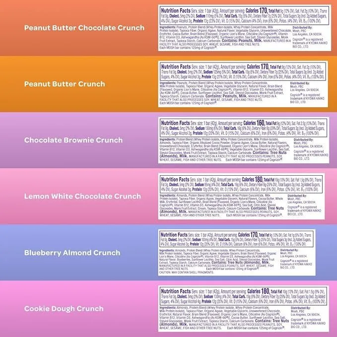 - MIND-BLOWING INGREDIENTS - MOSH clean protein bars are loaded with brain-enhancing nutrients like lion’s mane, ashwagandha, omega 3's, flaxseed, vitamin B12, and D3. Using a science-backed formulation called Cognizin, we provide nutritious and tasty bars for an active and busy lifestyle. They are perfect as a healthy midday snack for kids or a great addition to a college care package.