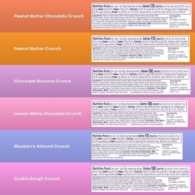 - MIND-BLOWING INGREDIENTS - MOSH clean protein bars are loaded with brain-enhancing nutrients like lion’s mane, ashwagandha, omega 3's, flaxseed, vitamin B12, and D3. Using a science-backed formulation called Cognizin, we provide nutritious and tasty bars for an active and busy lifestyle. They are perfect as a healthy midday snack for kids or a great addition to a college care package.