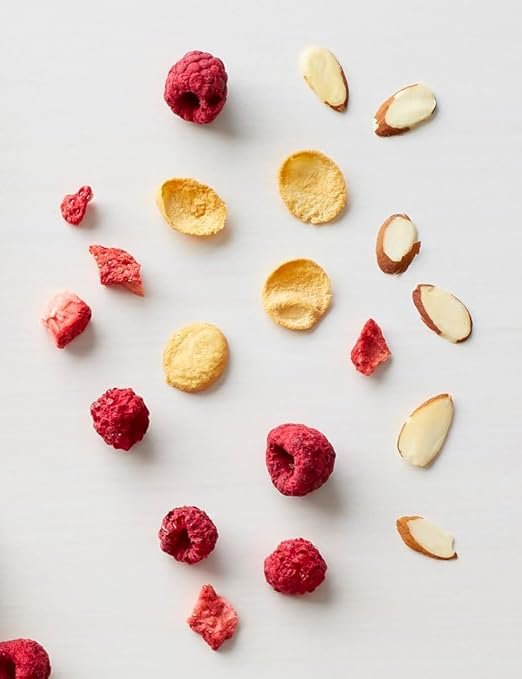 - Wholesome ingredients give this high protein cereal tons of amazing flavor. Made with real strawberries, raspberries and almonds for a sweet taste flavor you'll savor. The craveable combo of berries, almonds and sweet, crunchy flakes make this scrumptious breakfast cereal a hit with the whole family.