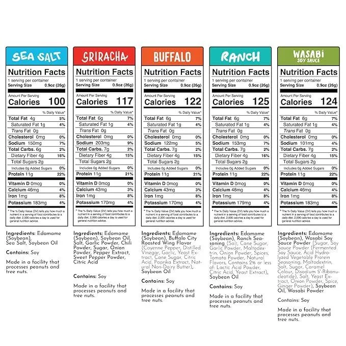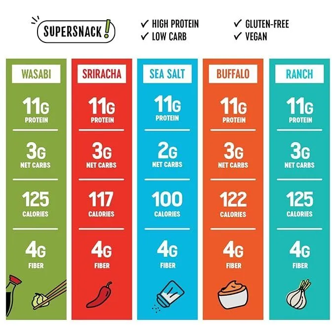 - HIGH PROTEIN SUPER-SNACK: Packed with 11 grams of complete plant based protein in a convenient individual wrapped 125 calorie snack pack perfect for the gym, as office snacks, or even a school lunch snack for kids! Delicious and bold flavors of Sea Salt, Ranch, Sriracha, Wasabi Soy Sauce, and Buffalo keep everyone coming back for more!