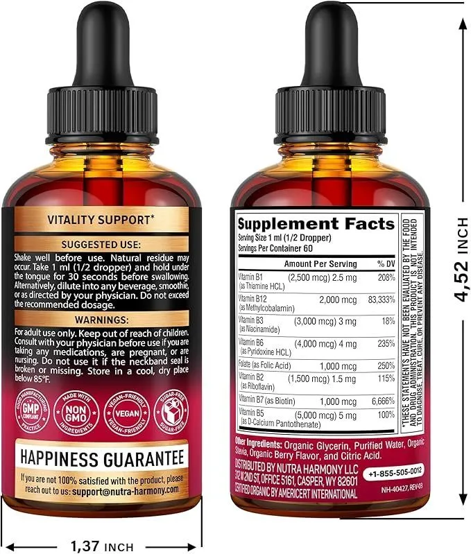 - Made with Care & Love – At NUTRAHARMONY, we desire to provide you with quality and outstanding service. If, for any reason, you are not happy with b complex liquid drops, just let us know! Drop a message to share your experience with b vitamins complex B1, B2, B3, B4, B5 Pantothenic Acid, B6, B7, B9 & Methylcobalamin B12!