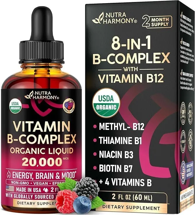 - USDA Organic Vitamin B Complex – Empower energized & vibrant you with our premium quality USDA-organic liquid b complex drops with vitamin B5 & Methylcobalamin B12. Organic vitamin b complex B1, B2, B3, B4, B5, B6, B7, B9 & B12 are designed to supercharge energy levels, this liquid powerhouse is a go-to source for feeling more alive and vibrant daily.