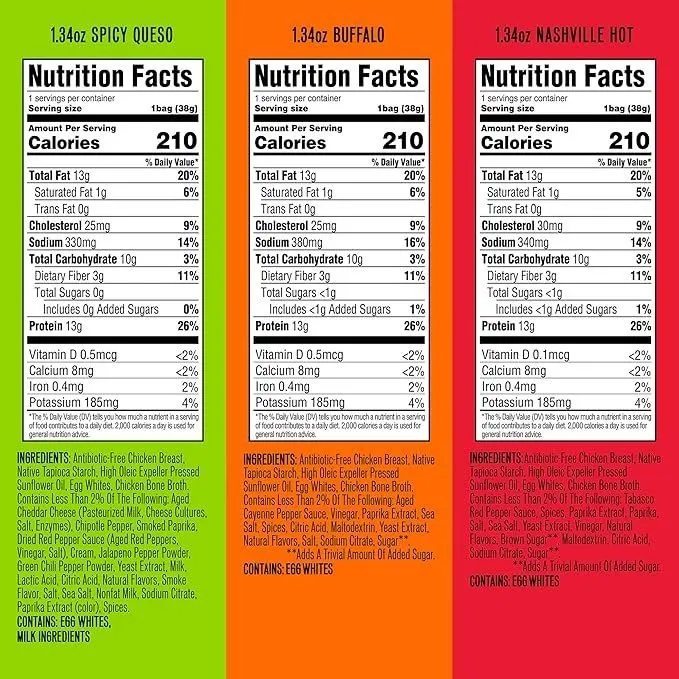 • SPICY CHIPS VARIETY PACK: Experience all our spicy chicken chips flavors in one high protein snack variety pack. Features 4x Buffalo, 4x Spicy Queso, and 4x Nashville Hot protein chips, all in convenient 1.34oz bags. Keto snacks for any diet!